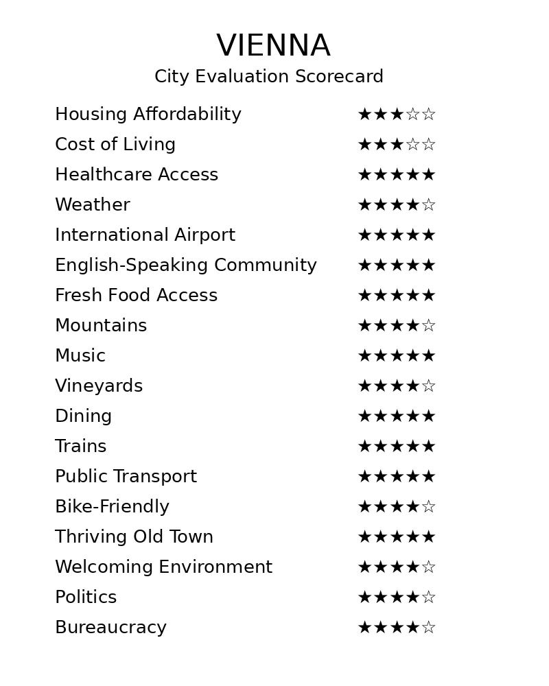 Zurich? Geneva? Vienna is about 40% cheaper to live in than those Swiss wonderlands. Surprisingly, the publication that calls itself “The Economist” doesn’t consider cost of living in its rankings of livability.